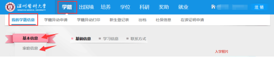 2. 登录成功后,点击“学籍-我的学籍信息-基本信息”及“家庭信息”,核对并修改相关信息。具体操作如下: