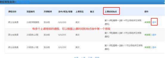 3、选班时,如遇到上课时间冲突的课程,处理方式如下:假设A课程有2个时段的班级,选中了第一个班级,操作B课程选班时,系统提示上课时间段冲突,那么可以将A课程班级更换为第二个班级。