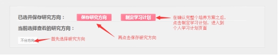 (1)选择培养方案研究方向:学生需要先选择研究方向,才能进入后续的个人学习计划制定的工作。流程:培养-选择方向-选择研究方向-保存研究方向-制定学习计划