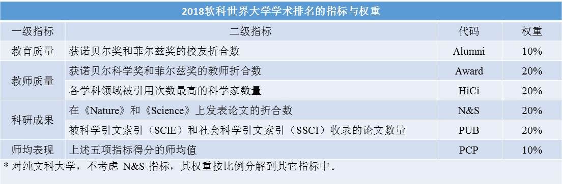 据悉,软科世界大学学术排名的前身是上海交通大学高等教育研究院发布的“世界大学学术排名”,自2003年首次发布以来,至今已连续发布了十六版。2018世界大学学术排名指标体系由教育质量、教师质量、科研成果和师均表现五个一级指标和获诺贝尔奖和菲尔兹奖的校友折合数(简称Alumni)、获诺贝尔奖和菲尔兹奖的教师折合数(简称Award)、各学科领域被引用次数最高的科学家数(简称HiCi)、在《自然》(Nature)和《科学》(Science)上发表论文的折合数(简称N&S)、被科学引文索引(SCIE)和社会科学引文索引(SSCI)收录的论文数(简称PUB)、上述五项指标得分的师均值(简称PCP)等六个二级指标对世界大学的学术表现进行排名。对大学在六项指标上的得分进行加权,令总得分最高的大学为100分,其它大学按其与最高值的比例得分。