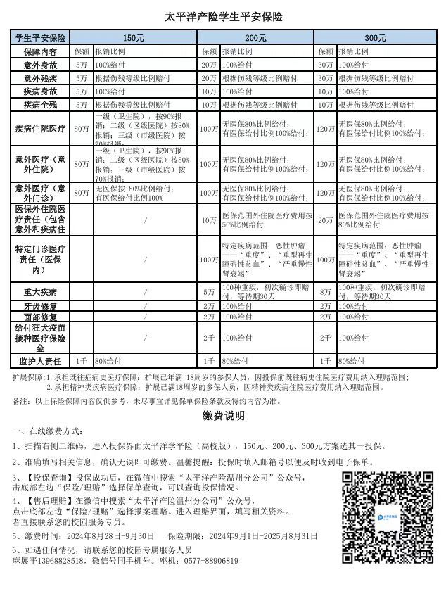 3、做好学生政策咨询答复工作。请各A片漫画 辅导员了解大学生医保险和学平险基本政策内容。寿保保险公司服务专员:杨弘(联系方式:18066327757),太保保险公司服务专员:余敏(联系方式:13587880077),将协助各位老师做好学生咨询答复。