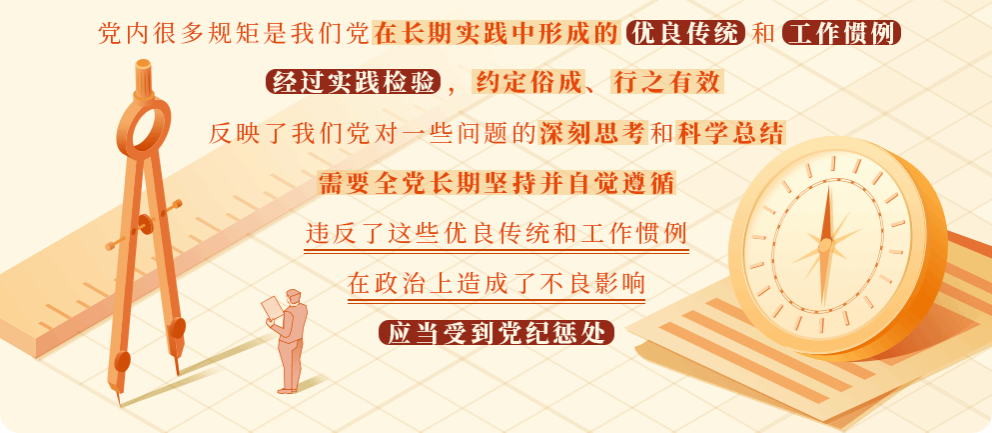 党内很多规矩是我们党在长期实践中形成的优良传统和工作惯例,经过实践检验,约定俗成、行之有效,反映了我们党对一些问题的深刻思考和科学总结,需要全党长期坚持并自觉遵循。这些规矩看着没有白纸黑字的规定,但都是一种传统、一种范式、一种要求。违反了这些优良传统和工作惯例,在政治上造成了不良影响,应当受到党纪惩处。