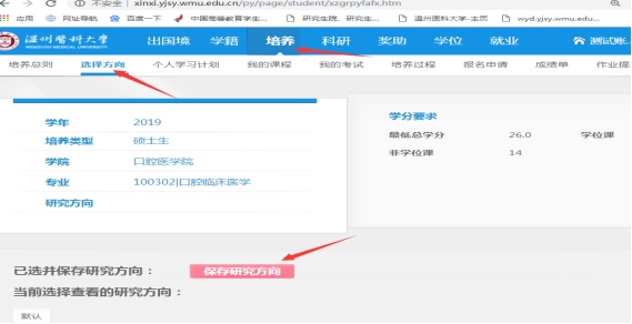 1)选择培养方案研究方向:学生需要先选择研究方向,才能进入后续的个人学习计划制定的工作。流程:点击培养---选择方向---选择研究方向(此处研究方向的选择开设课程关联,不会影响实际科研研究方向,大部分专业此处方向为默认,选择默认”。